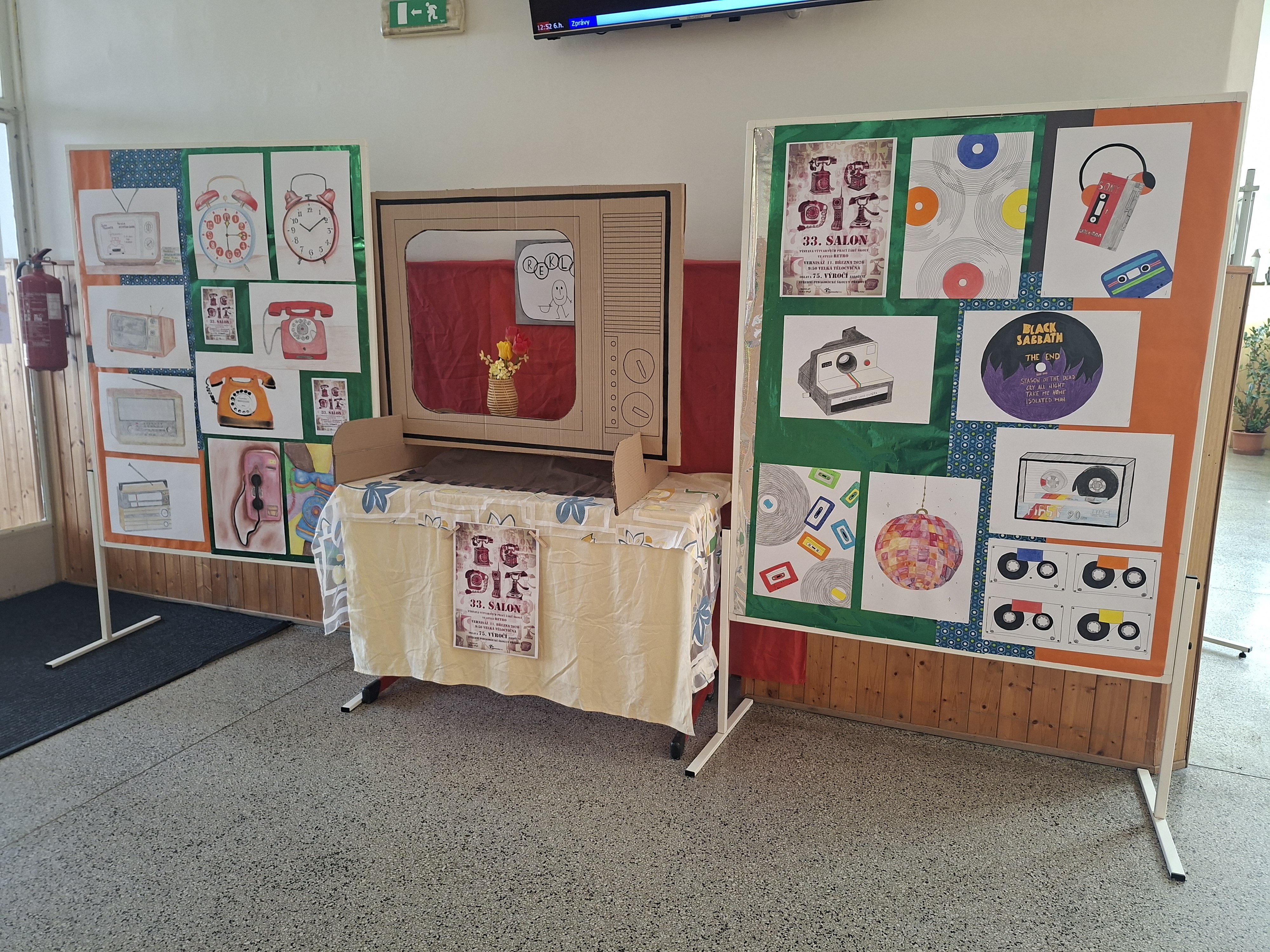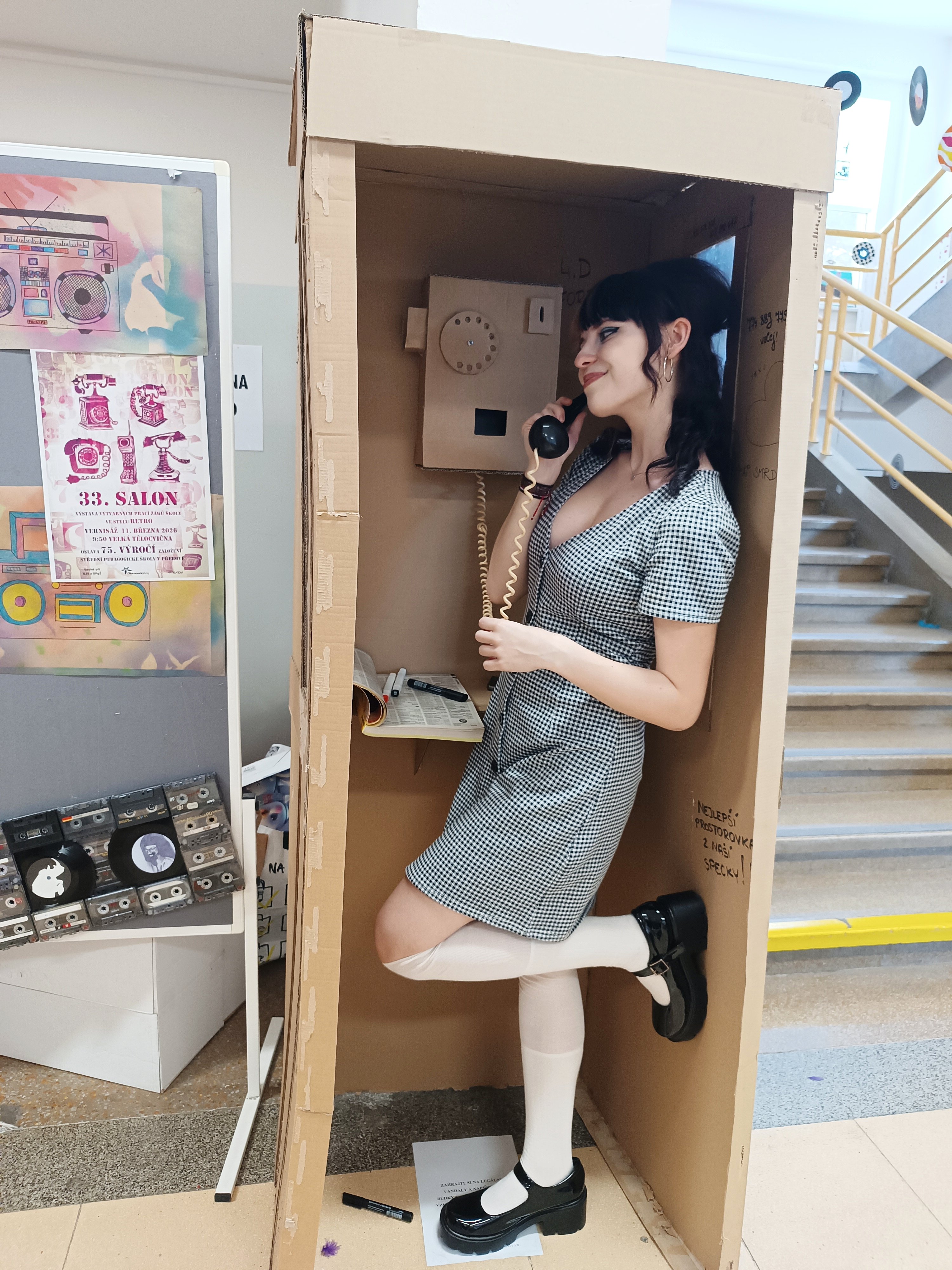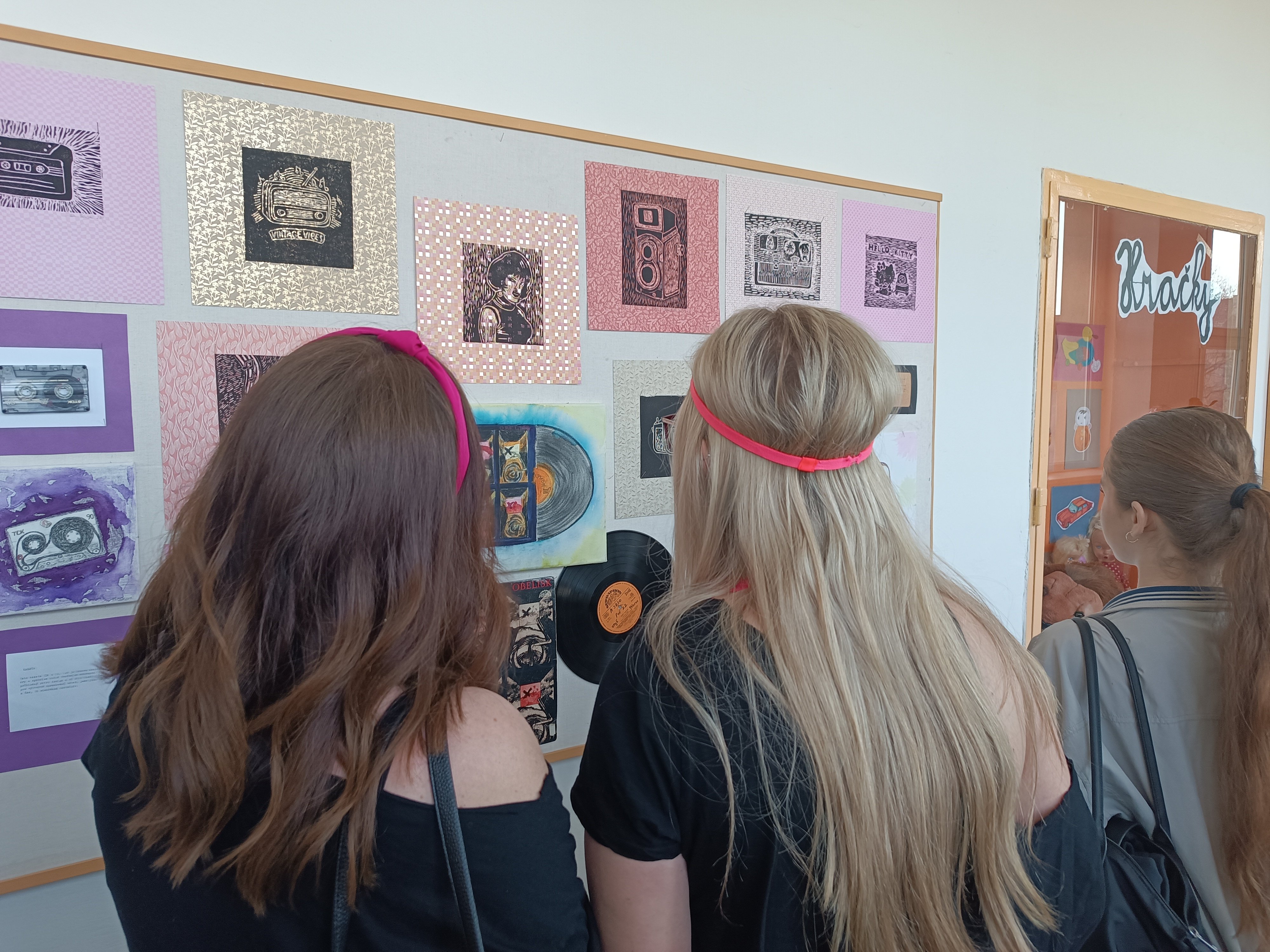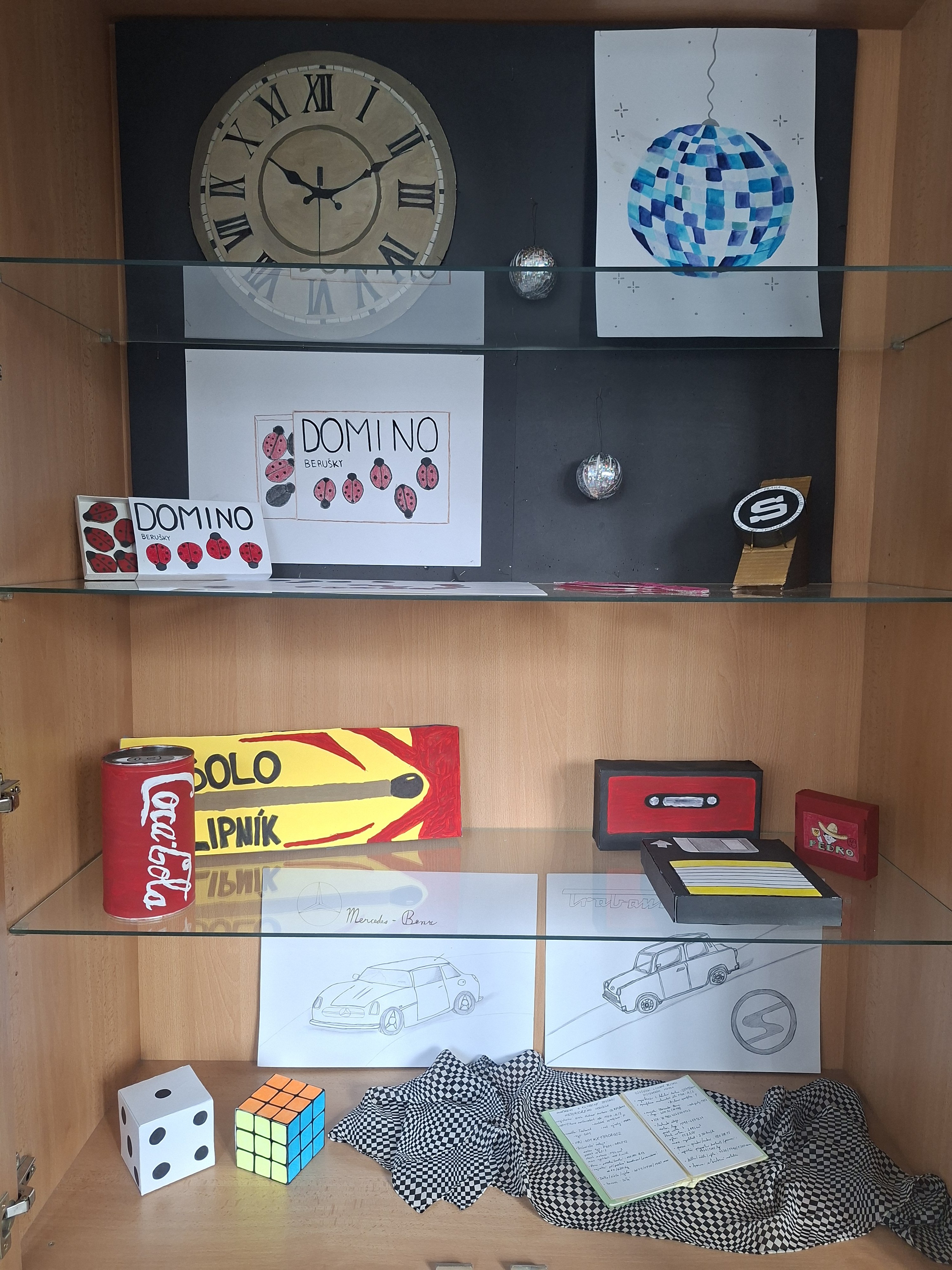 Na výstavě jsou tedy zastoupeny různé výtvarné techniky – od kresby a malby přes grafiku až po kombinované techniky i prostorové práce. Každé dílo nese osobitý rukopis svého autora a odráží nejen studijní zadání, ale také individuální pohled studentů na zvolené téma. Součástí výstavy jsou také tematické instalace, které návštěvníky přenášejí do atmosféry minulých let. K vidění je například stylizované retro hračkářství, cukrárna, dětský pokoj, kadeřnictví či krejčovský salon. Zajímavou částí expozice je také přehlídka starších technických zařízení, například telefonů, kazeťáků, hudebních nosičů a dalších předmětů, které dnes již patří spíše do historie každodenního života. Výjimečným objektem celé výstavy je kartonová telefonní budka, která patří k nepřehlédnutelným a originálním prvkům instalace.