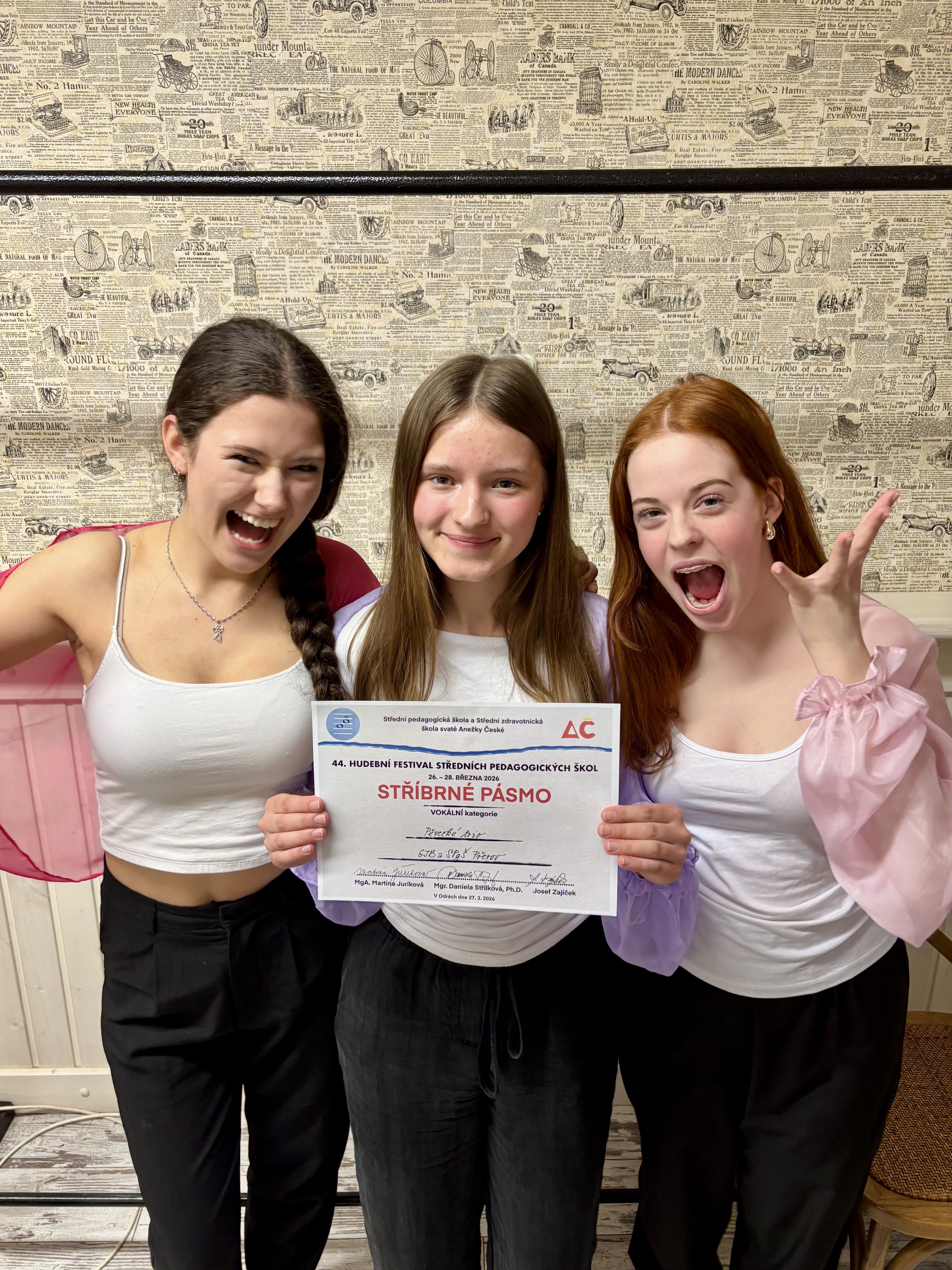 Ve dnech 26.-28. 3. 2026 se v Odrách uskutečnil 44. ročník Hudebního festivalu pedagogických škol, jehož součástí je každý rok i soutěž pěveckých komorních uskupení, sborů a školních kapel. Naši školu reprezentovalo trio děvčat z 2. CP - Helena Budějovská, Štěpánka Jurečková a Eliška Tomečková. Vystoupení s nimi připravila p. uč. Moučková a na klavír doprovodila p. uč. Mičková. Konkurence byla opravdu velká, holky se ale i tak umístily v krásném stříbrném pásmu. Moc gratulujeme, děkujeme za vzornou reprezentaci a těšíme se na příště.