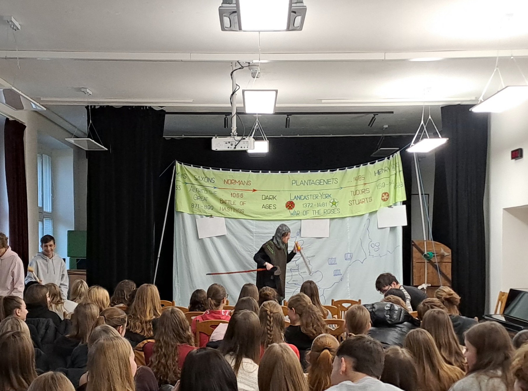 Dne 26. listopadu se žáci třetích ročníků a kvinty zúčastnili anglického divadelního představení The History of England – Part 1. V této hře dostali odpovědi na otázky jako: Kdo postavil Stonehenge? Čím byl Alfred Veliký tak výjimečný? A jaký osud potkal šest manželek Jindřicha VIII.? Od dob Římanů až po vládu královny Alžběty I. přiblížil tento program dějiny Anglie poutavou a interaktivní formou, která studenty skutečně vtáhla do děje.