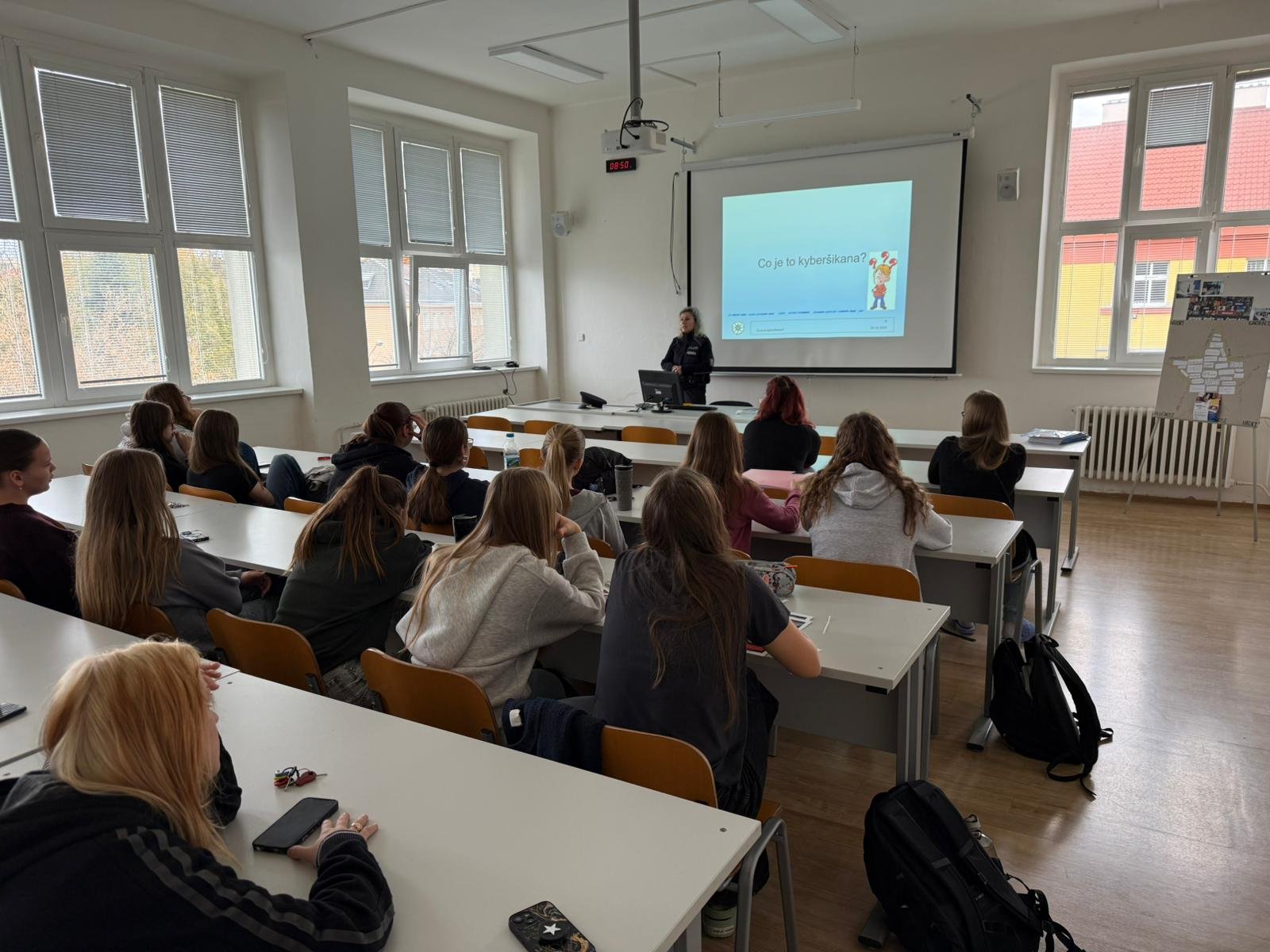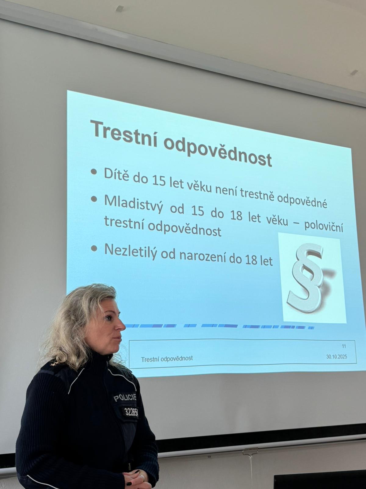 Od 30. října 2025 probíhají na naší škole besedy prvních ročníků s Policií České republiky. Besedy jsou součástí preventivního programu školy a seznamují žáky s nebezpečím kyberšikany. Žáci také získají základy právního vědomí.