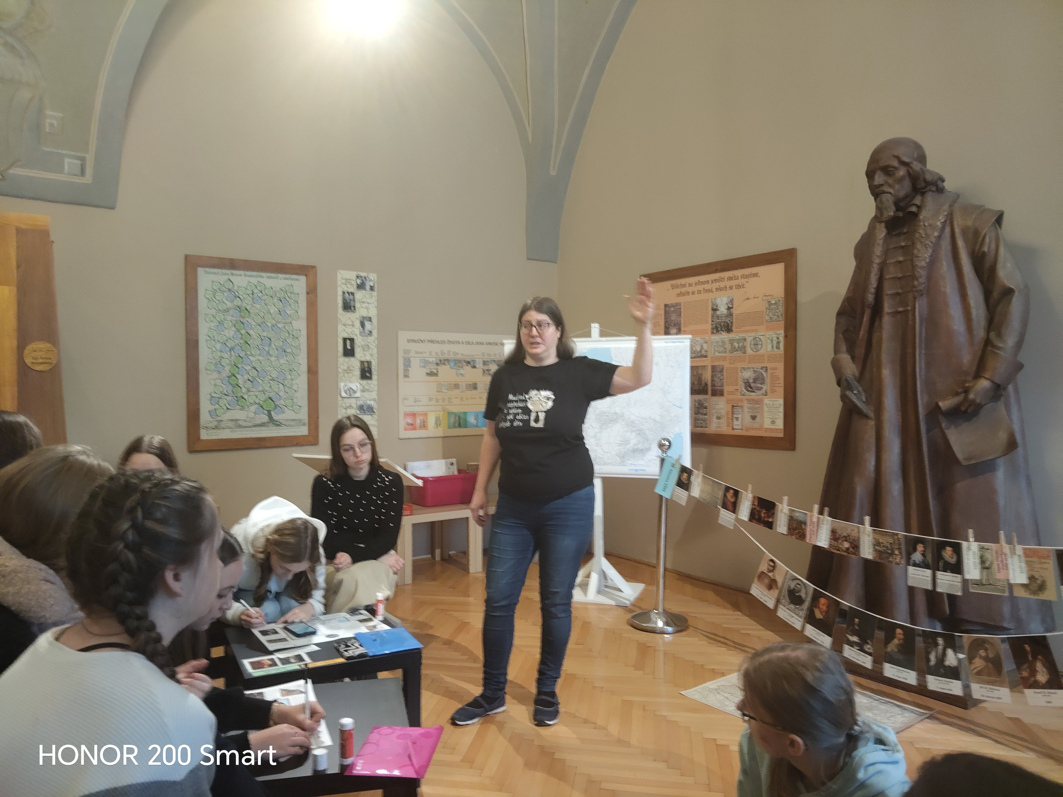 Dne 13. 1. 2026 naše třída 4. D v rámci výuky pedagogiky navštívila Muzeum Komenského v Přerově. Téma edukační činnosti bylo Putování s J. A. Komenským. Nejprve jsme se obecně seznámili s jeho osobností a životem, následně jsme se rozdělili do skupin a zapojili se do různých aktivit. Připomněli jsme si důležitá data a historické události spojené s dobou, ve které Komenský žil.