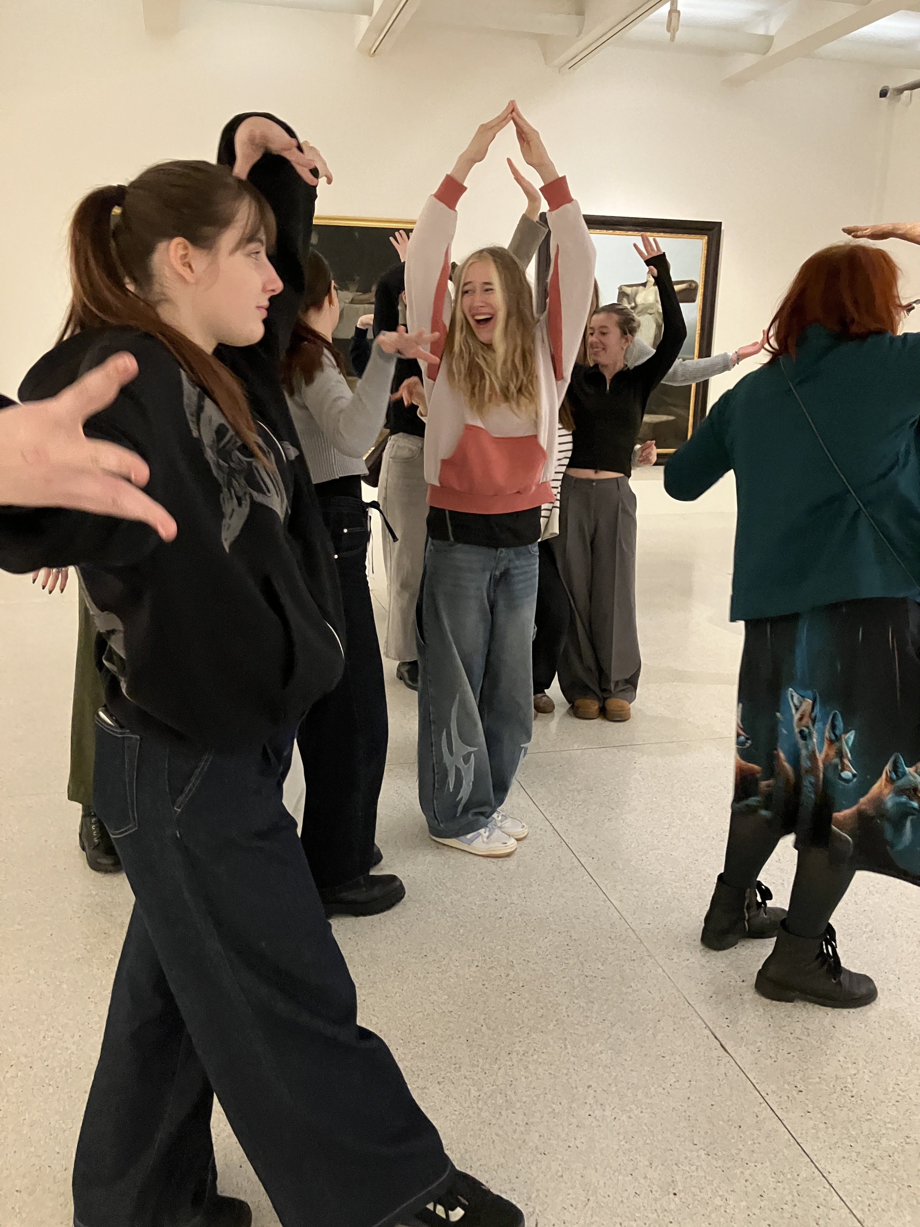 Poté jsme se přesunuly do Veletržního paláce na program Silák Herakles. Pod svá křídla nás vzala MgA. Jana Machalíková. Díky ní jsme si mohly vyzkoušet, jakými všemožnými zábavnými dramatickými způsoby lze dětem přiblížit řeckou mytologii. Plížily jsme se před zlými kmeny, zpívaly se sirénou, šplhaly na skálu, střílely s Heraklem na ptáky a dokonce jsme „obětovaly“ jednu z nás kentaurům.