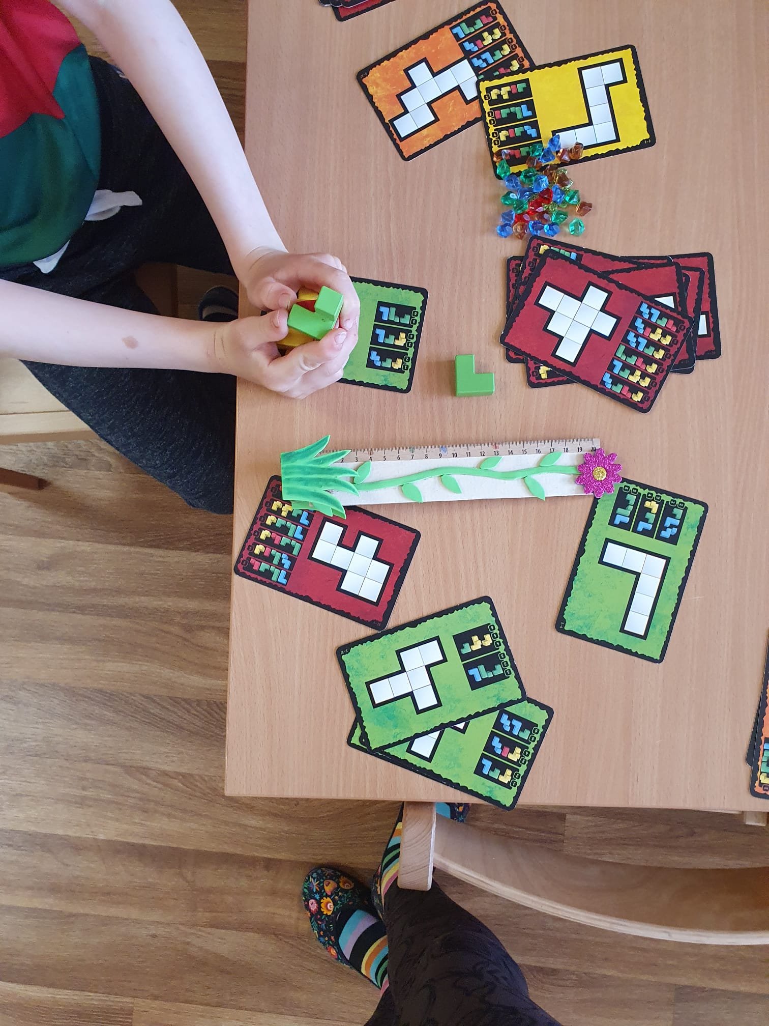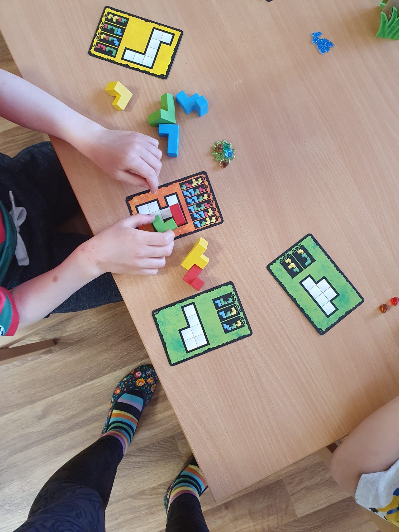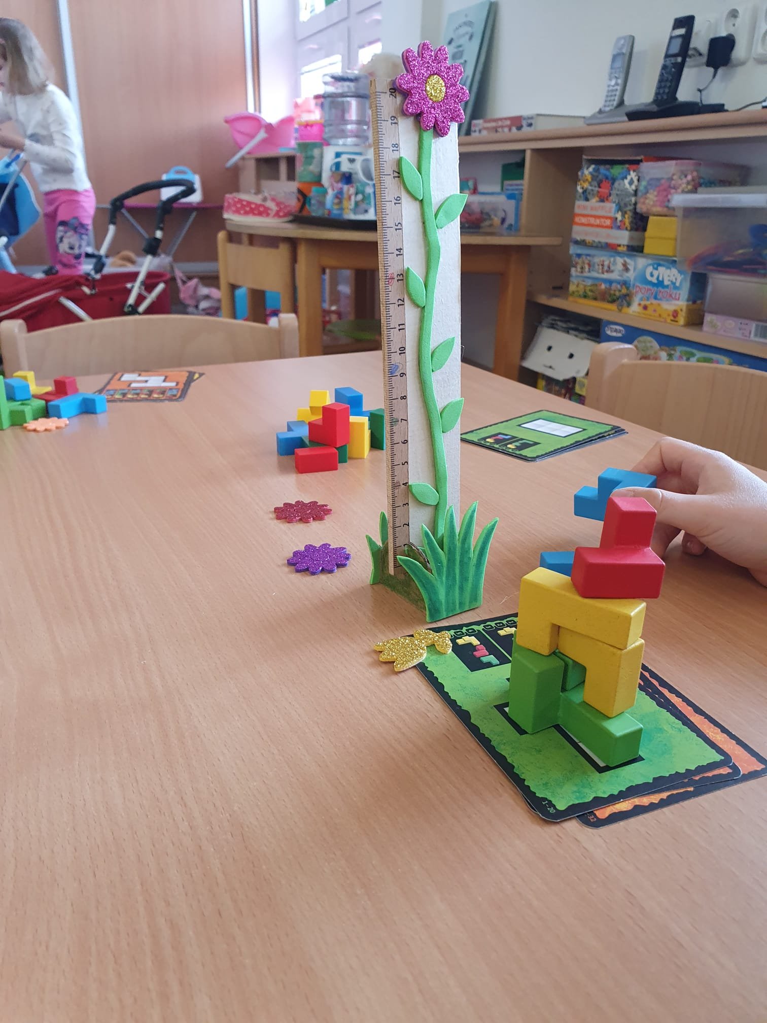 Děti se do hry zapojily s velkým nadšením. Skládaly barevné tvary podle předloh, zkoušely různé kombinace a rozvíjely tak svou prostorovou představivost, logické myšlení i jemnou motoriku.